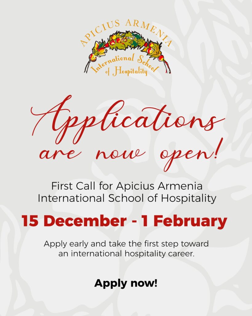 Ապիցիուս Արմենիա միջազգային դպրոցը պաշտոնապես բացել է դիմումների ընդունումը 2026 թվականի ուսումնական տարվա համար: Դպրոցը առաջարկում է պրոֆեսիոնալ կրթություն և փորձառական ուսուցում հյուրընկալության, ռեստորանային և խոհարարական ոլորտներում: