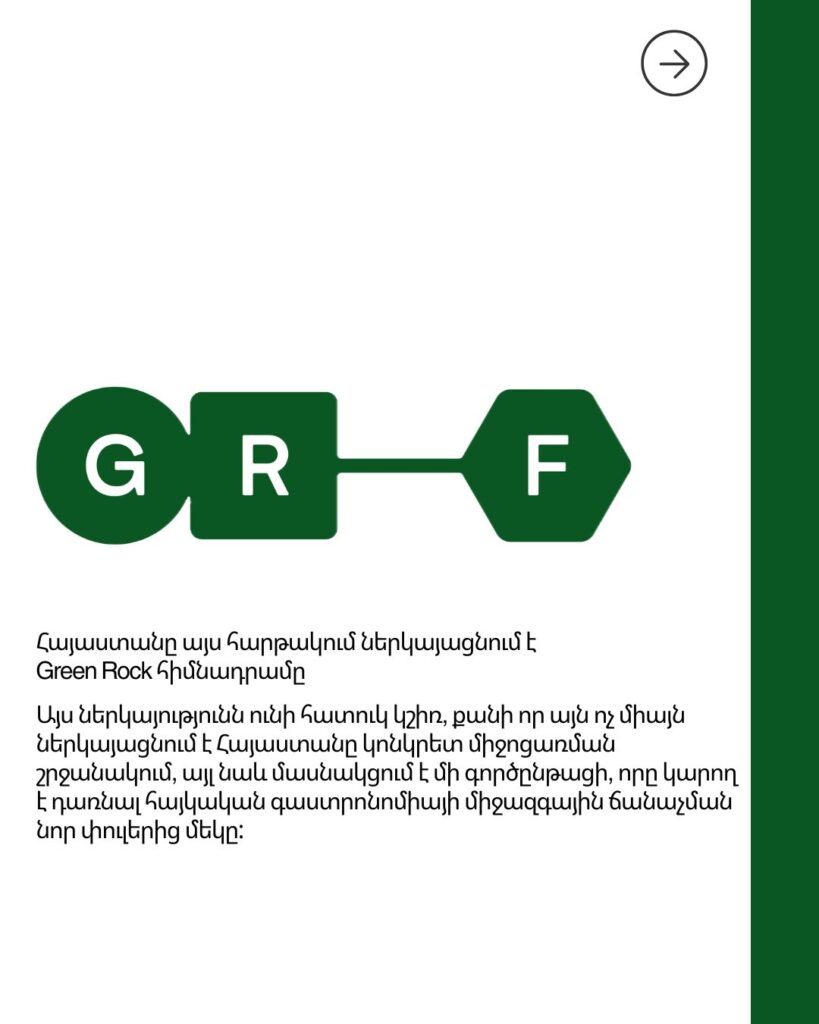 Հենց այստեղ է Green Rock հիմնադրամ հիմնադրամի ներկայացուցչական առաքելության կարևորությունը։ Հայաստանը ներկայացնելով այս հարթակում՝ հիմնադրամը, ըստ էության, խոսում է երկրի անունից մի ոլորտի մասին, որը վաղուց արդեն դուրս է միայն խոհանոցային ընկալումներից։ Հայկական գաստրոնոմիան իր մեջ միավորում է հողը, կլիման, գյուղատնտեսական փորձը, ավանդույթը, ընտանեկան սեղանի մշակույթը, գինեգործությունը, տեղական արտադրանքը և հյուրասիրության դարավոր կերպարը։ Այս ամբողջությունը միջազգային հարթակում ներկայացնելը նշանակում է ներկայացնել ոչ միայն համերի աշխարհ, այլ ամբողջ մի մշակութային մտածողություն։